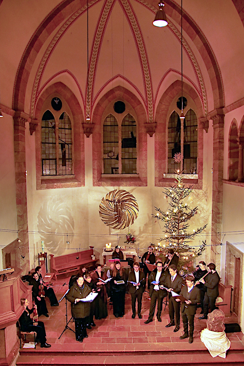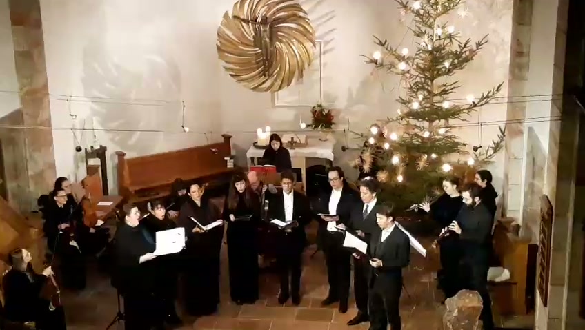 Zur Aufführung gelangte diesmal die „Historia der freudenreichen Geburt Jesu Christi“ von Heinrich Schütz, einem Spätwerk dieses bedeutenden Barockkomponisten aus dem Jahre 1664. Musikalisch geschildert wird die Weihnachtsgeschichte nach dem Lukasevangelium von der Reise von Maria und Joseph nach Bethlehem über Jesu Geburt bis zu seiner Jugendzeit. Neu an diesem Werk war seinerzeit die Auflockerung der Gesangsstücke durch die reichliche Einbeziehung instrumentaler Nummern mit charakteristischem Kolorit für die jeweilige Szene. So werden beispielsweise Hirtenszene, Wiegenlied, Engelsverkündung oder die Hohenpriester musikalisch illustriert. Die dazwischen geschobenen Bibeltexte werden vom Evangelisten gesungen (hier die warme und füllige Tenorstimme von Luca Gotti).
