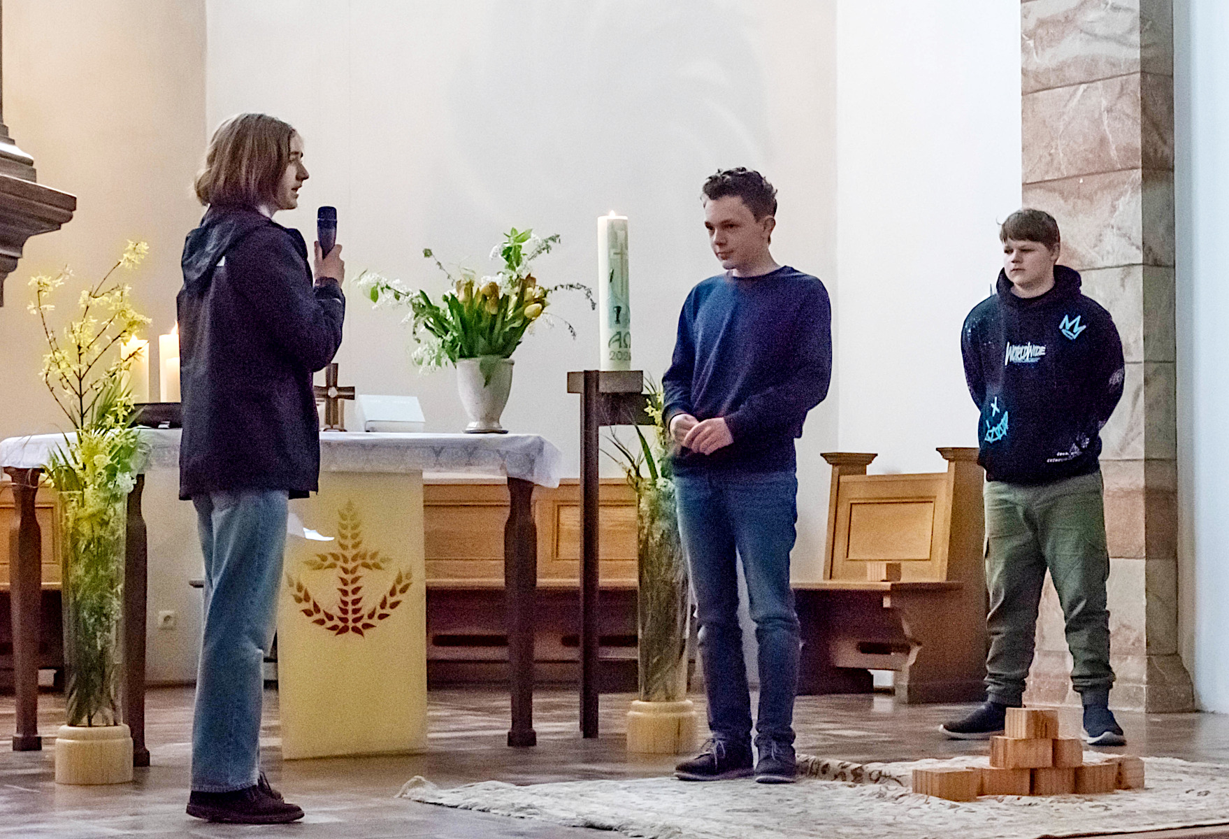 Eine Gruppe übertrug spannend die Angst der Israeliten vor den Meereswellen auf ihre eigenen Ängste, symbolisiert durch Steine, die vor dem Altar abgelegt wurden. Eine andere Gruppe machte in einem kleinen Anspiel klar, wie sehr sie sich wünschten, mit ihren realen Ängsten von den Erwachsenen auch ernst genommen zu werden. Und wiederum andere Konfirmanden übersetzten das „Gelobte Land“ der Israeliten in ihre eigenen Wünsche für die Zukunft oder zählten berührend und mit Witz auf, bei passender Musikuntermalung, was für sie die Punkte seien, auf die sie vertrauten. (Einige von ihnen hätten sogar noch mehr Text übernommen, so beschäftigte sie das Thema.)