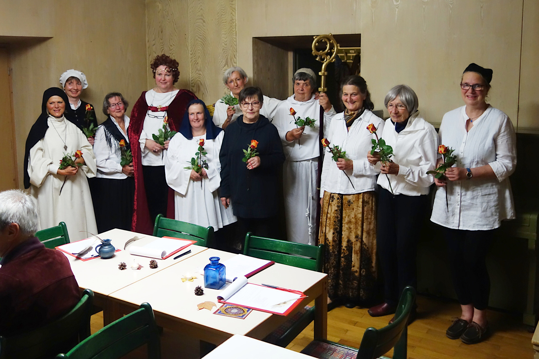 Es konnten zwar nicht alle Details des Spiels geschichtsgetreu umgesetzt werden, doch der Inhalt der Szenen entsprach Wort für Wort den überlieferten Schriften. Und die Frauen hatten viel Mühe darauf verwendet, passende Gewänder zu nähen, den „Klosterraum“ ansprechend auszustatten und vor allem sich mit der doch ungewohnten Sprache vertraut zu machen. Pfarrer Christian Gerstner und seine Frau Maria bedankten sich zum Abschluss dieser Zeitreise bei den Frauen mit Rosen und gespendeten Kräutersträußchen.