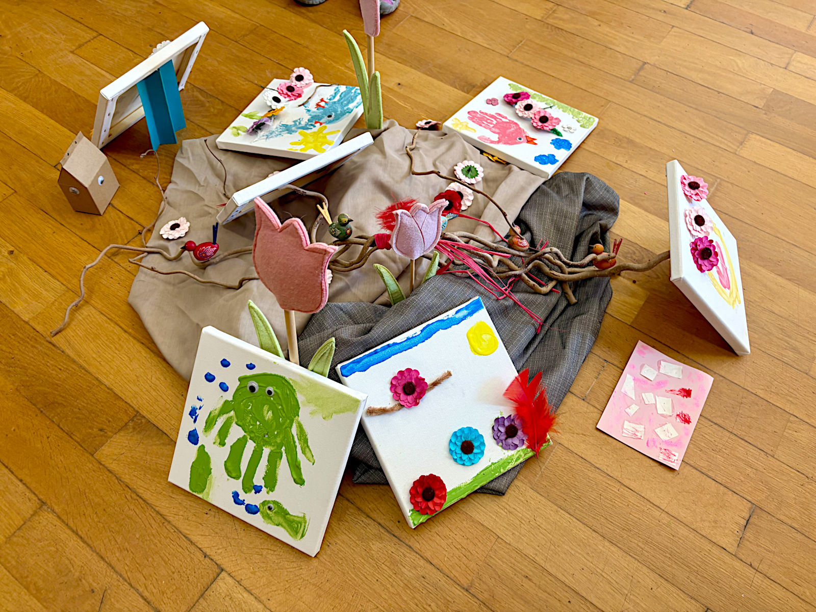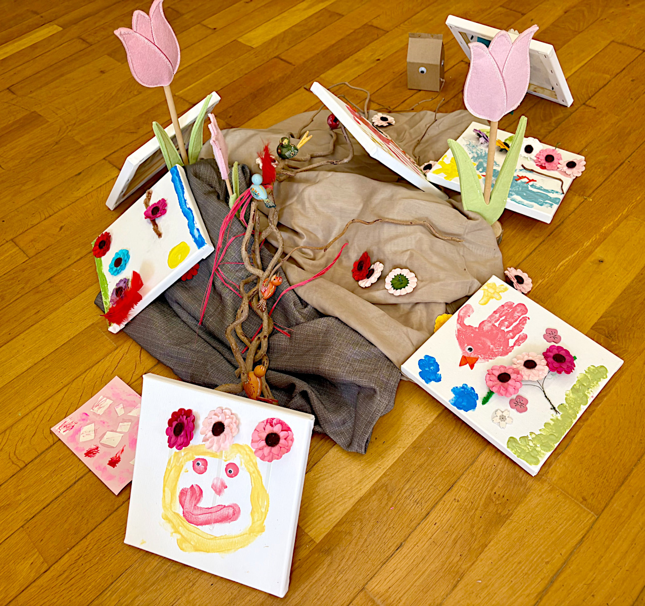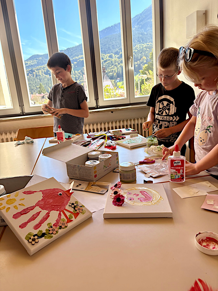 Im kreativen Teil gestalteten die Kinder bunte „Sorgenvögel“: Aus ihren Handabdrücken mit Fingerfarbe entstanden farbenfrohe Bilder auf Leinwänden – jeder Finger ein Flügel, jedes Bild ein Ausdruck von Vertrauen und Hoffnung.