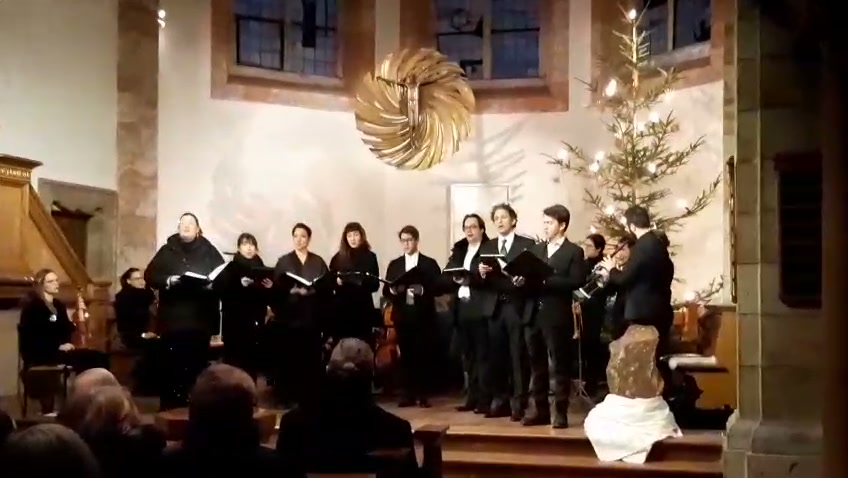 Zur Aufführung gelangte diesmal die „Historia der freudenreichen Geburt Jesu Christi“ von Heinrich Schütz, einem Spätwerk dieses bedeutenden Barockkomponisten aus dem Jahre 1664. Musikalisch geschildert wird die Weihnachtsgeschichte nach dem Lukasevangelium von der Reise von Maria und Joseph nach Bethlehem über Jesu Geburt bis zu seiner Jugendzeit. Neu an diesem Werk war seinerzeit die Auflockerung der Gesangsstücke durch die reichliche Einbeziehung instrumentaler Nummern mit charakteristischem Kolorit für die jeweilige Szene. So werden beispielsweise Hirtenszene, Wiegenlied, Engelsverkündung oder die Hohenpriester musikalisch illustriert. Die dazwischen geschobenen Bibeltexte werden vom Evangelisten gesungen (hier die warme und füllige Tenorstimme von Luca Gotti).