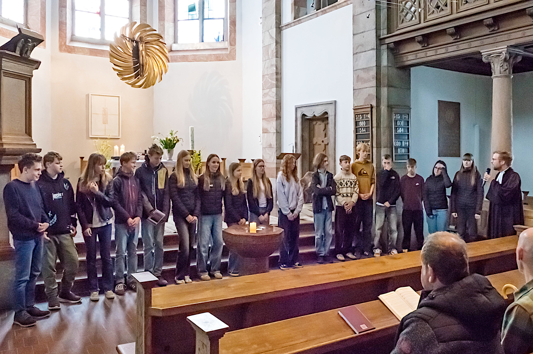 Ein volles Kirchenschiff mit vielen jungen Menschen „an Bord“ (die aktuelle Konfirmandengruppe mit ihren Eltern), dazu schwungvolles Orgelspiel zur Begrüßung (von Monika Nestle) und dann ein Pfarrer, der „nur“ moderiert (Dr. Josef Höglauer), aber 17 Konfirmandinnen und Konfirmanden, die eigenverantwortlich und höchst engagiert den Sonntags-Gottesdienst gestalten (und sogar Lieder auf der Orgel begleiten) – so konnte mit Freude mitgefeiert sowie Gott und auch einander begegnet werden.