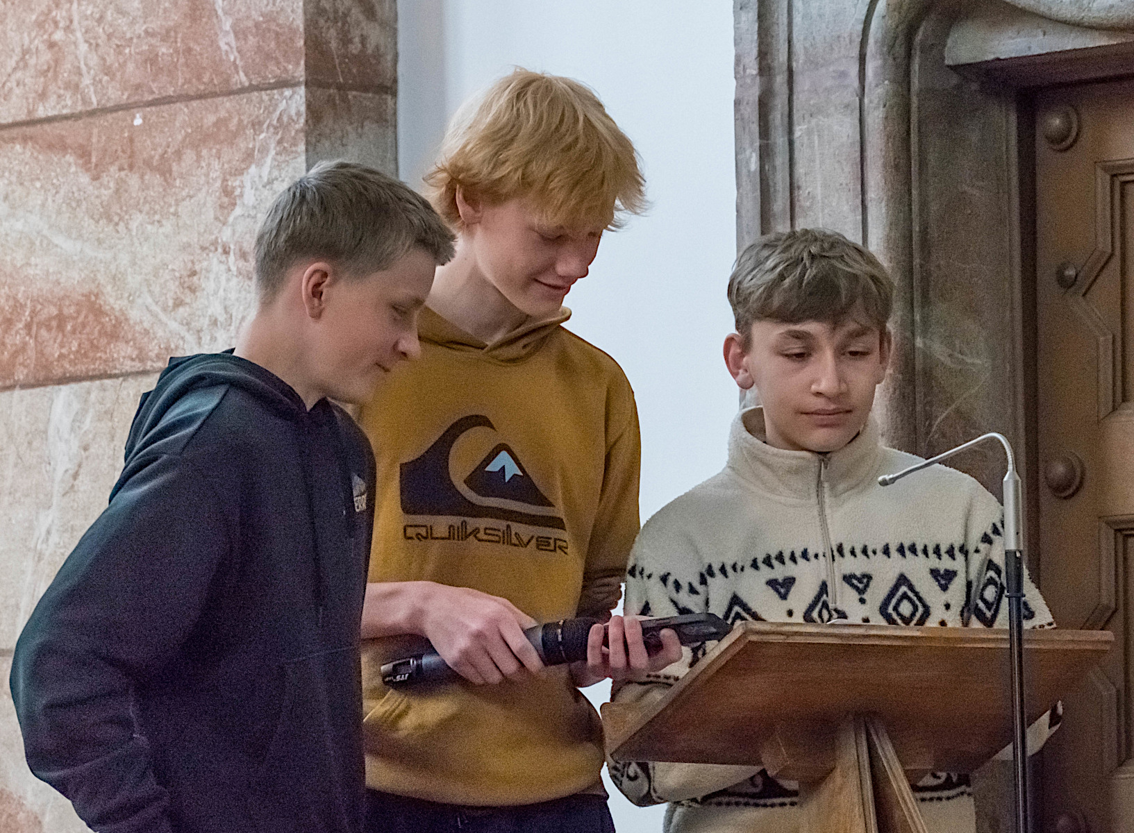 Eine Gruppe übertrug spannend die Angst der Israeliten vor den Meereswellen auf ihre eigenen Ängste, symbolisiert durch Steine, die vor dem Altar abgelegt wurden. Eine andere Gruppe machte in einem kleinen Anspiel klar, wie sehr sie sich wünschten, mit ihren realen Ängsten von den Erwachsenen auch ernst genommen zu werden. Und wiederum andere Konfirmanden übersetzten das „Gelobte Land“ der Israeliten in ihre eigenen Wünsche für die Zukunft oder zählten berührend und mit Witz auf, bei passender Musikuntermalung, was für sie die Punkte seien, auf die sie vertrauten. (Einige von ihnen hätten sogar noch mehr Text übernommen, so beschäftigte sie das Thema.)